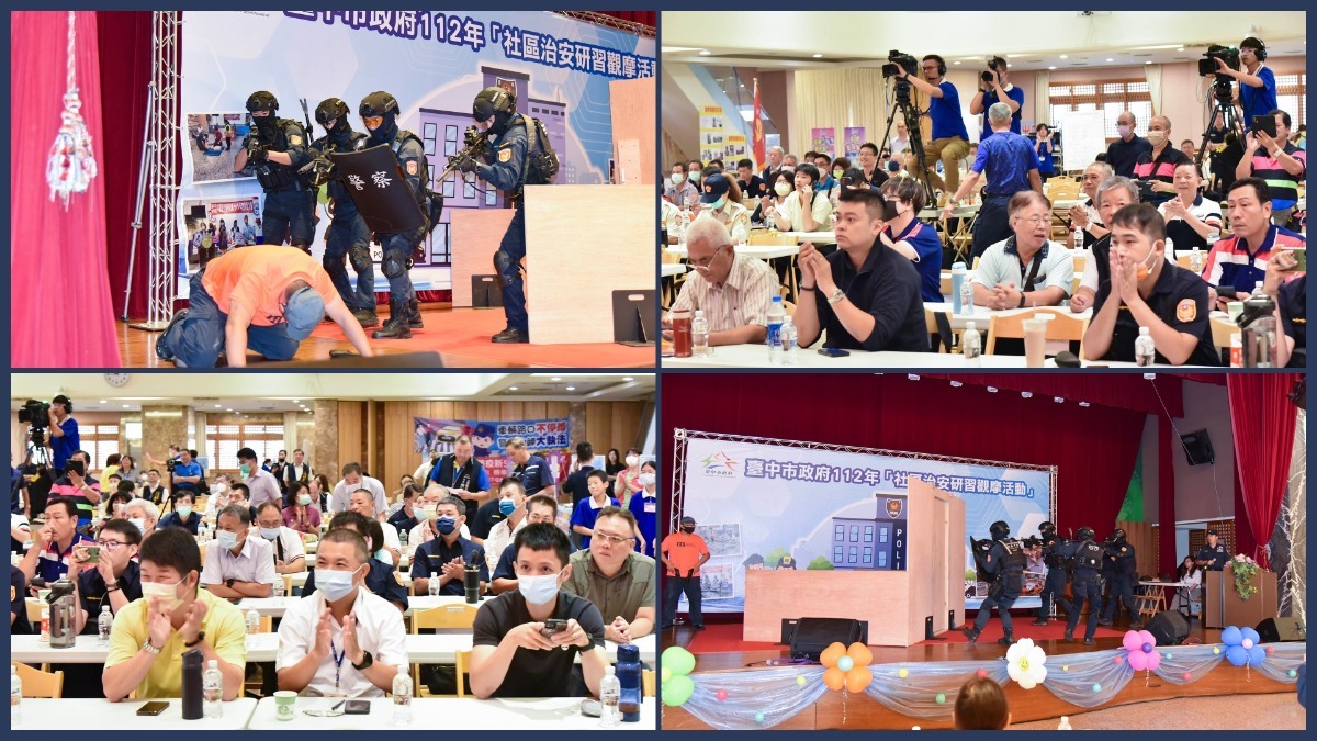 本次研習觀摩不僅強調了社區治安的重要性,還著眼於多元活動的融合,為社區居民帶來了豐富體驗。開場由台中市警察局安排警技示範,霹靂隊現場示範重大槍枝犯罪攻防,由持槍歹徒潛入住家,霹靂隊狙擊手於制高點就位,霹靂小隊進場攻堅,順利制伏持槍歹徒,展示了高超的技藝和良好的作戰能力。